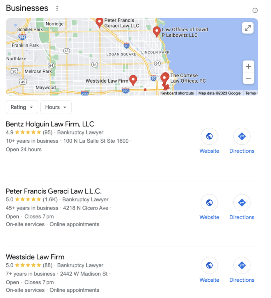 As you can see, GBPs present scores for law firms out of five stars, and they’re visible at the top of search results: