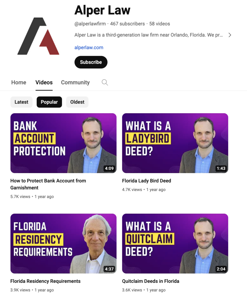 Alper Law, for instance, runs a specialized bankruptcy law YouTube channel to help break down complex topics and guide people to their bankruptcy services: