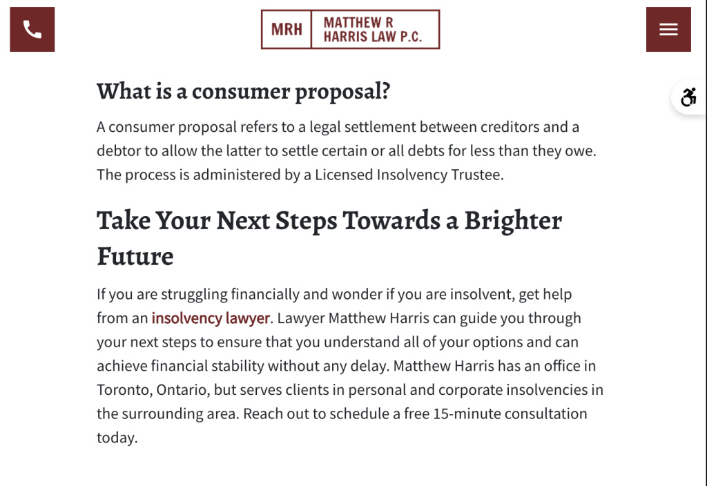 Once your SEO expert compiles a list of keywords, you can optimize your website’s content around them to attract searchers. You might write blog posts around specific keywords or answer questions about insolvency: