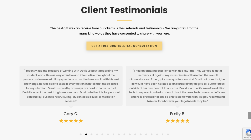 Here’s an example of a bankruptcy lawyer using a carousel-style testimonials section at the bottom of a landing page: