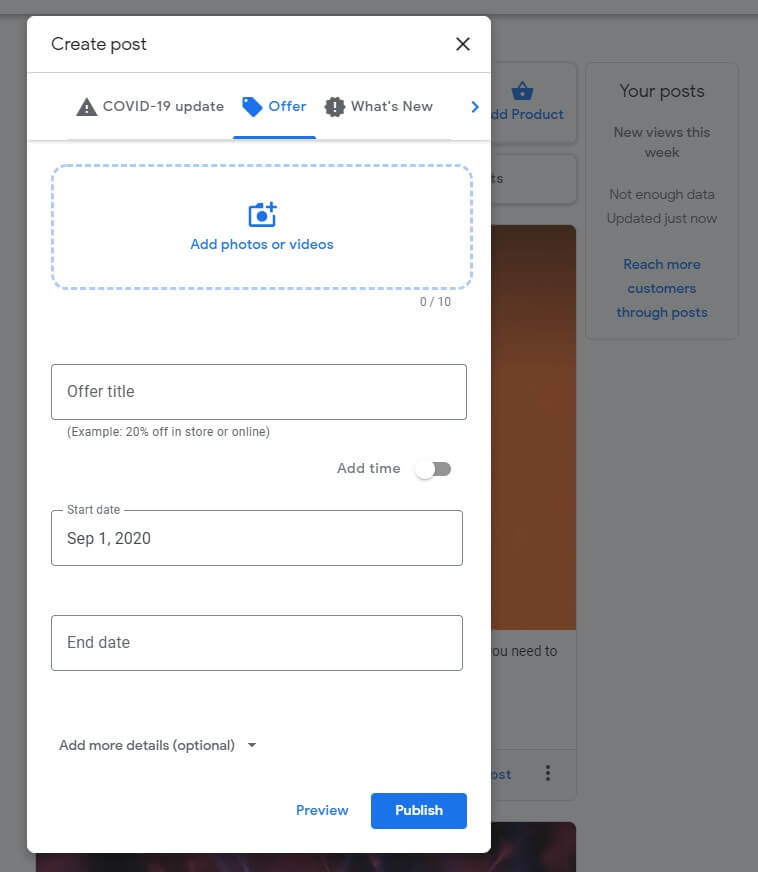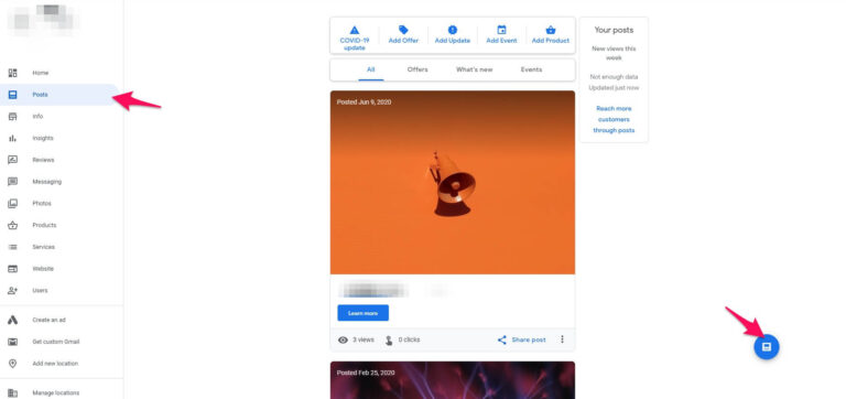 Google has also begun ranking profiles higher that continually post updates. Click the “Post” tab and the bottom right button to create a new post.