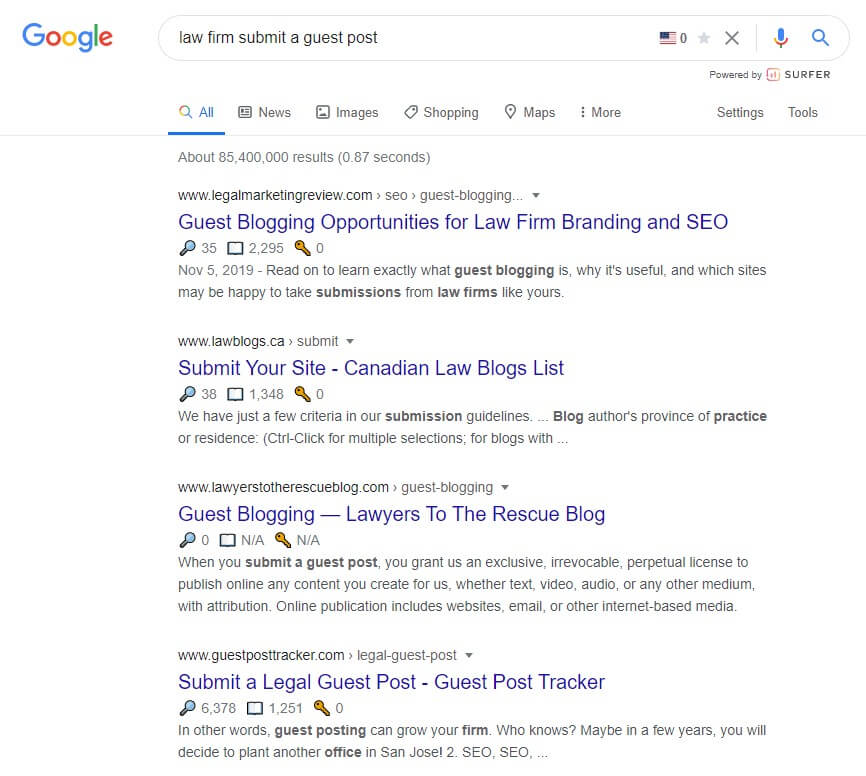 The first step is finding other related legal websites to guest author on. The goal is to find publications that have similar audiences so the backlinks drive the most authority and referral traffic converts more. One way I recommend is with a simple Google search. Enter queries like: