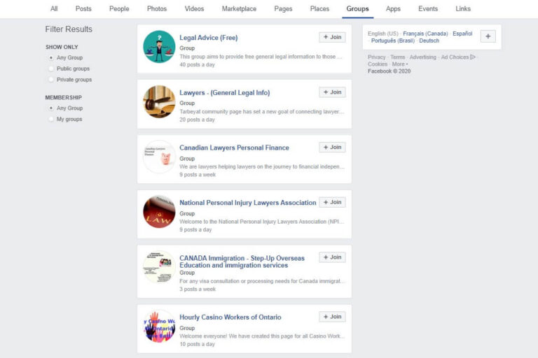 Once your family law content is published, it has to be promoted. This generates initial traffic as Google indexes and ranks it. I recommend first promoting each blog post on social media channels like LinkedIn and Facebook. Better yet, leverage groups on platforms like Facebook to instantly reach more users. Search for keywords like “lawyers” and filter by groups.