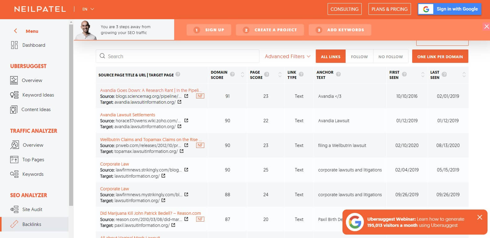Look for any backlinks that appear as guest posts. These will typically have anchor text of the law firm itself or an individual attorney. They will also be on very contextual websites. Save any legal related sites in a spreadsheet for the next step.
