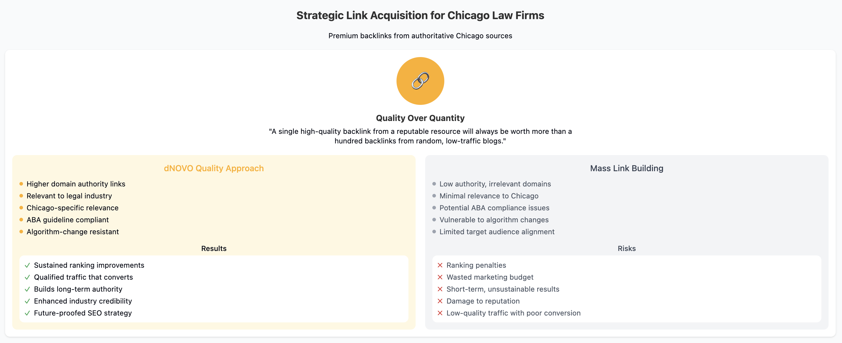Backlinks signal that your website is a trustworthy resource for legal issues in Chicago. A single high-quality backlink from a reputable resource will always be worth more than a hundred backlinks from random, low-traffic blogs.
