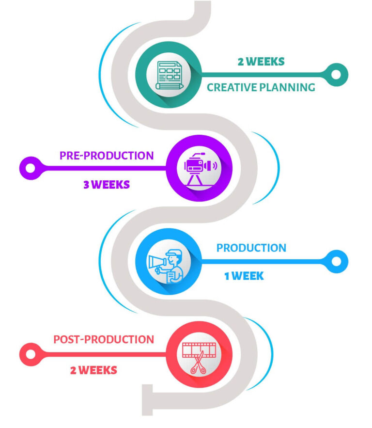 • The pre-production phase takes 2-3 weeks. We’ll help you create a production calendar, write and edit the script for your videos, onboard the required talent, and scout and book the ideal location.