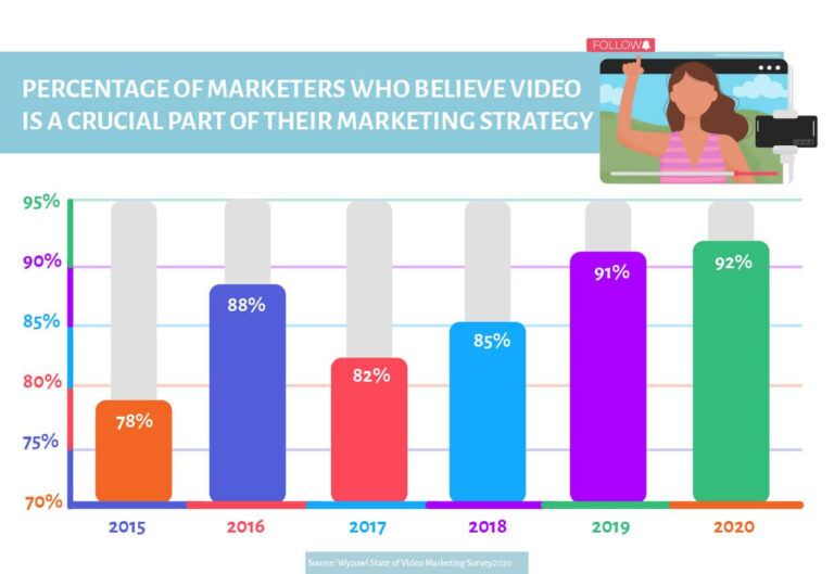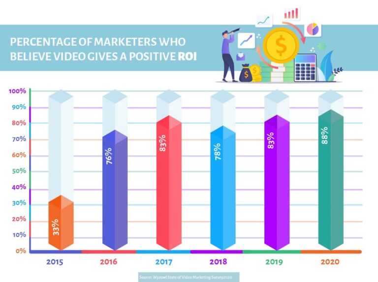 In 2020, 92% of marketers reported that video is an integral part of their marketing strategy. The numbers have increased from 78% in 2015. When it comes to ROI, a whopping 88% of marketers reported that video earns them a positive ROI. Only 33% felt the same way back in 2015.